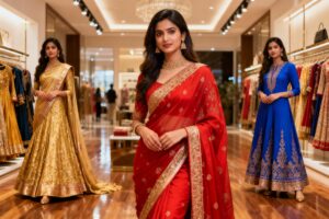 Below are generated images that capture the essence of Adhishree Boutique’s Indian ethnic wear collection:
